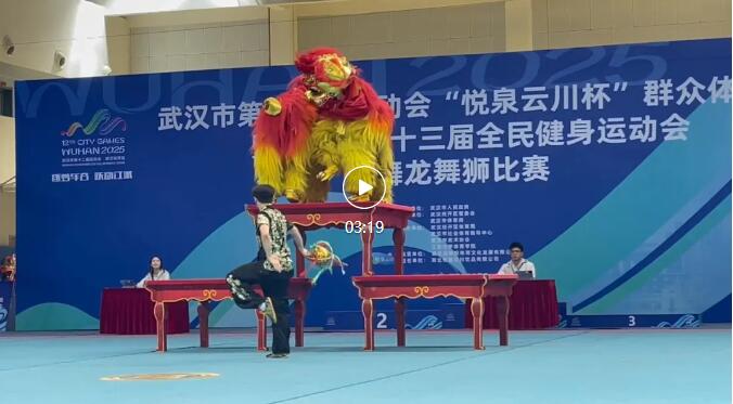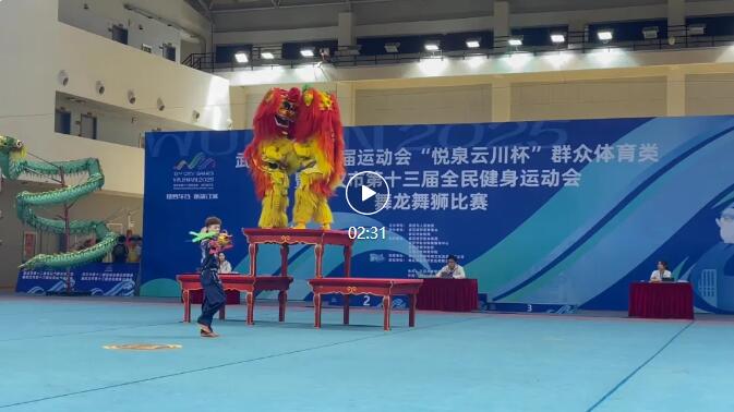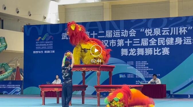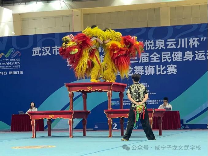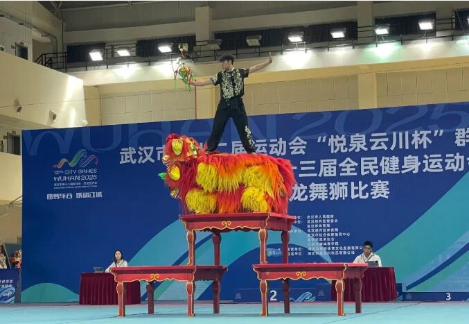 赛场上,子龙健儿以高难度狮艺技惊四座。1.6米高台上,雄狮凌空三连跃,落点精准;狮头倒挂台顶,270 度凌空翻转采青,惊险刺激;狮尾独力托举,狮头抬尖金鸡独立,稳若磐石;蒙眼横跨 1.5 米台距,尽显默契与胆魄;双狮在 160cm 台面同步飞旋,气势如虹。每个动作都凝聚着队员们的心血。